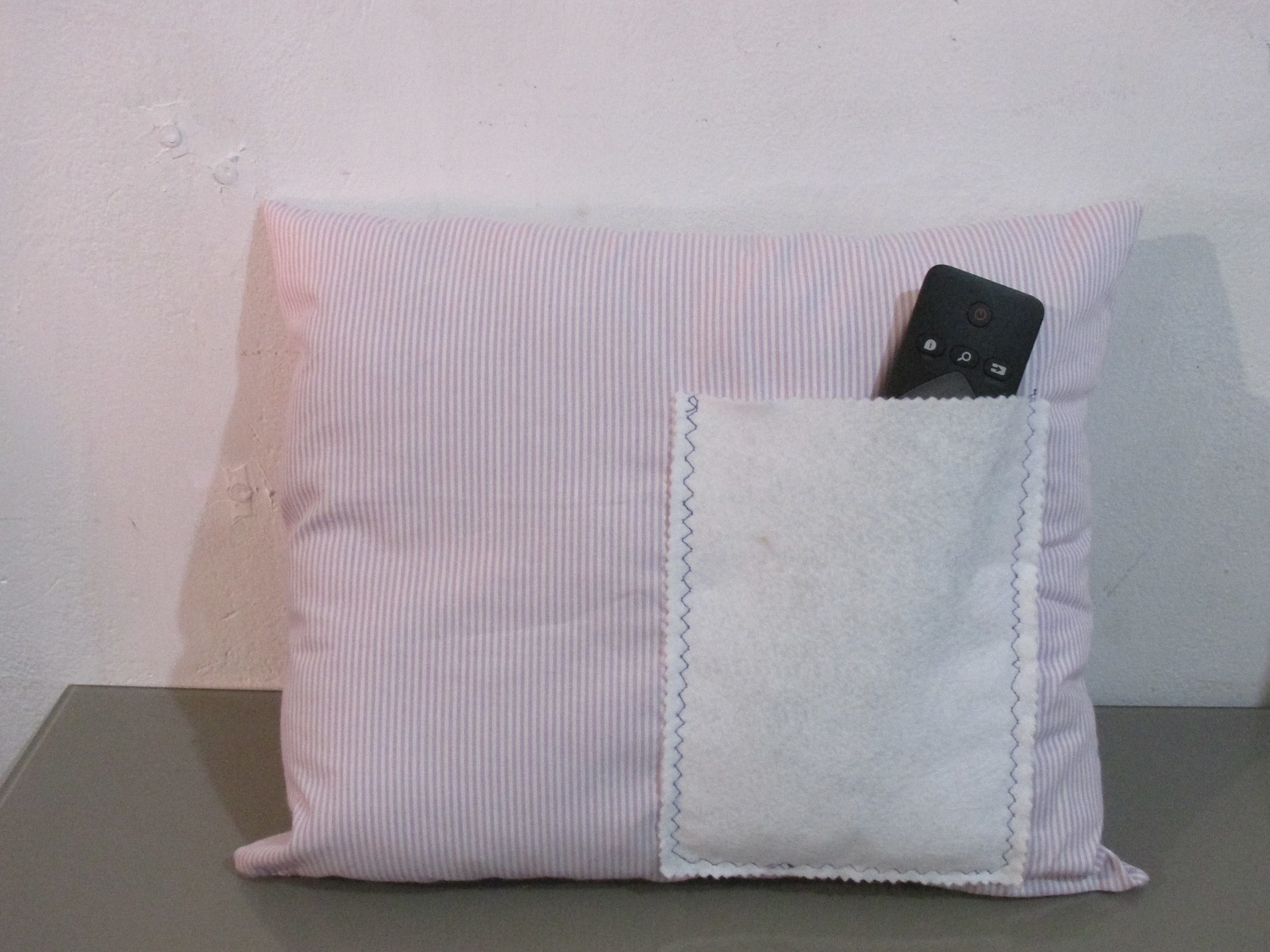 Almofada em tecido e feltro com bolso para colocar controle remoto.